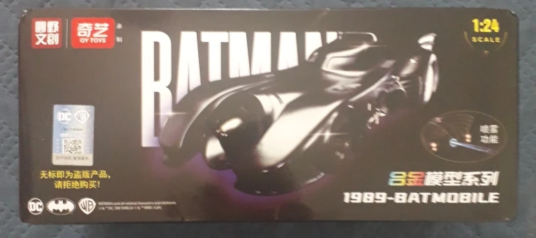 The package includes one Batman 1989 Batmobile 1:24 scale die-cast metal model car with spray function, securely packaged for safe delivery
