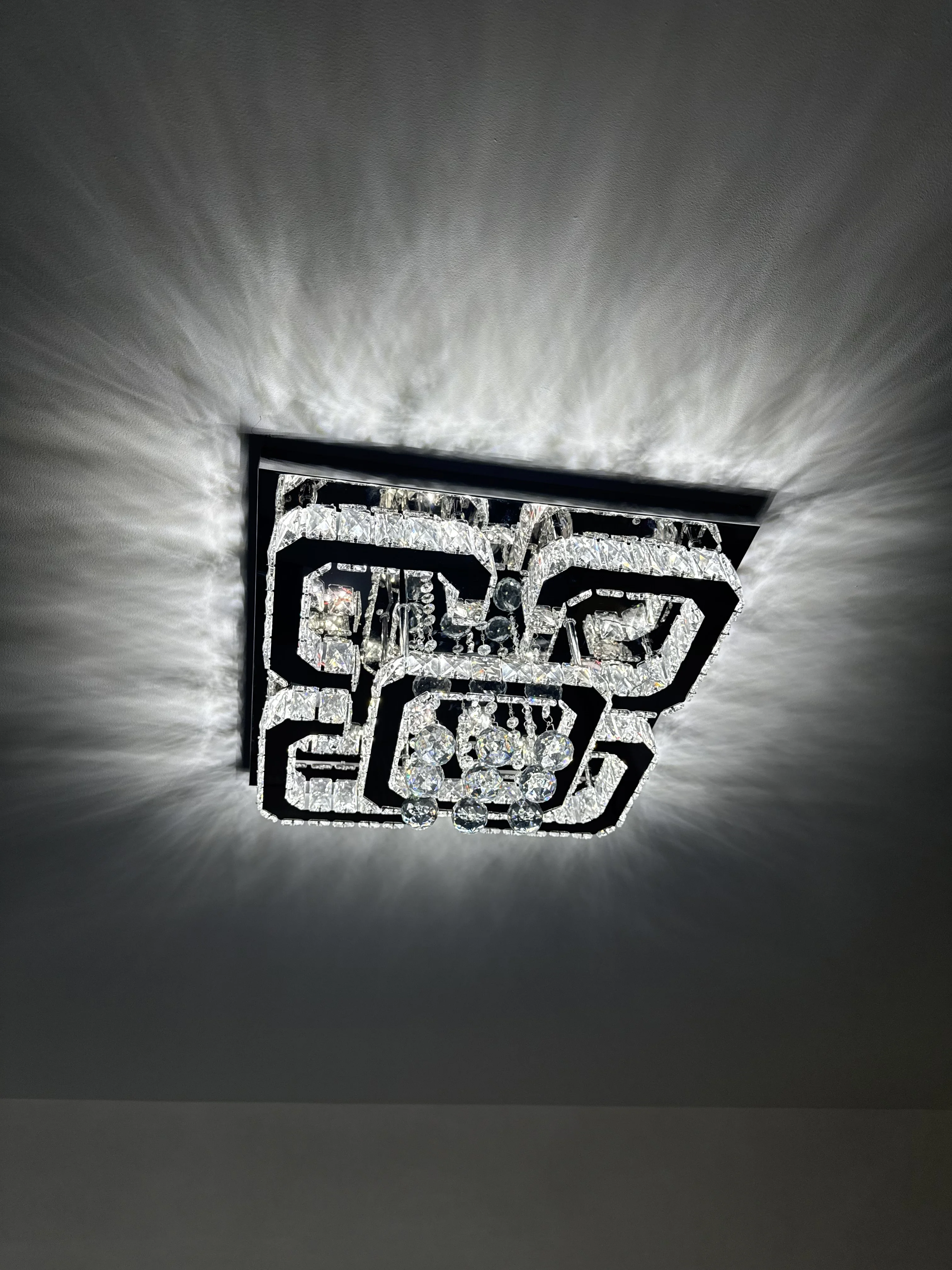 This contemporary crystal LED ceiling light blends sleek geometry with dazzling crystal detailing to create a captivating focal point. The square silhouette is perfectly balanced with precision-cut crystal droplets, allowing light to refract beautifully across the room, forming an elegant criss-cross glow that enhances both atmosphere and style.