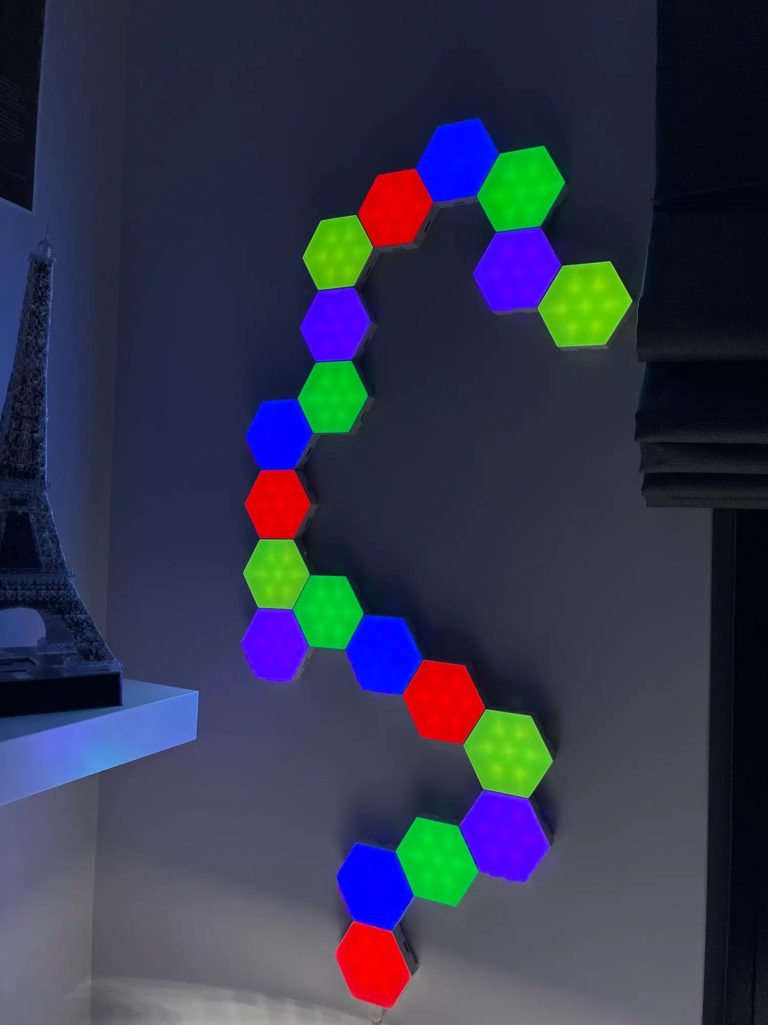 Perfect for bedrooms, gaming rooms, living rooms or creative spaces, these modular hexagon panels let you design your own wall layout while enjoying millions of colours, dynamic effects and intelligent controls right from your phone.