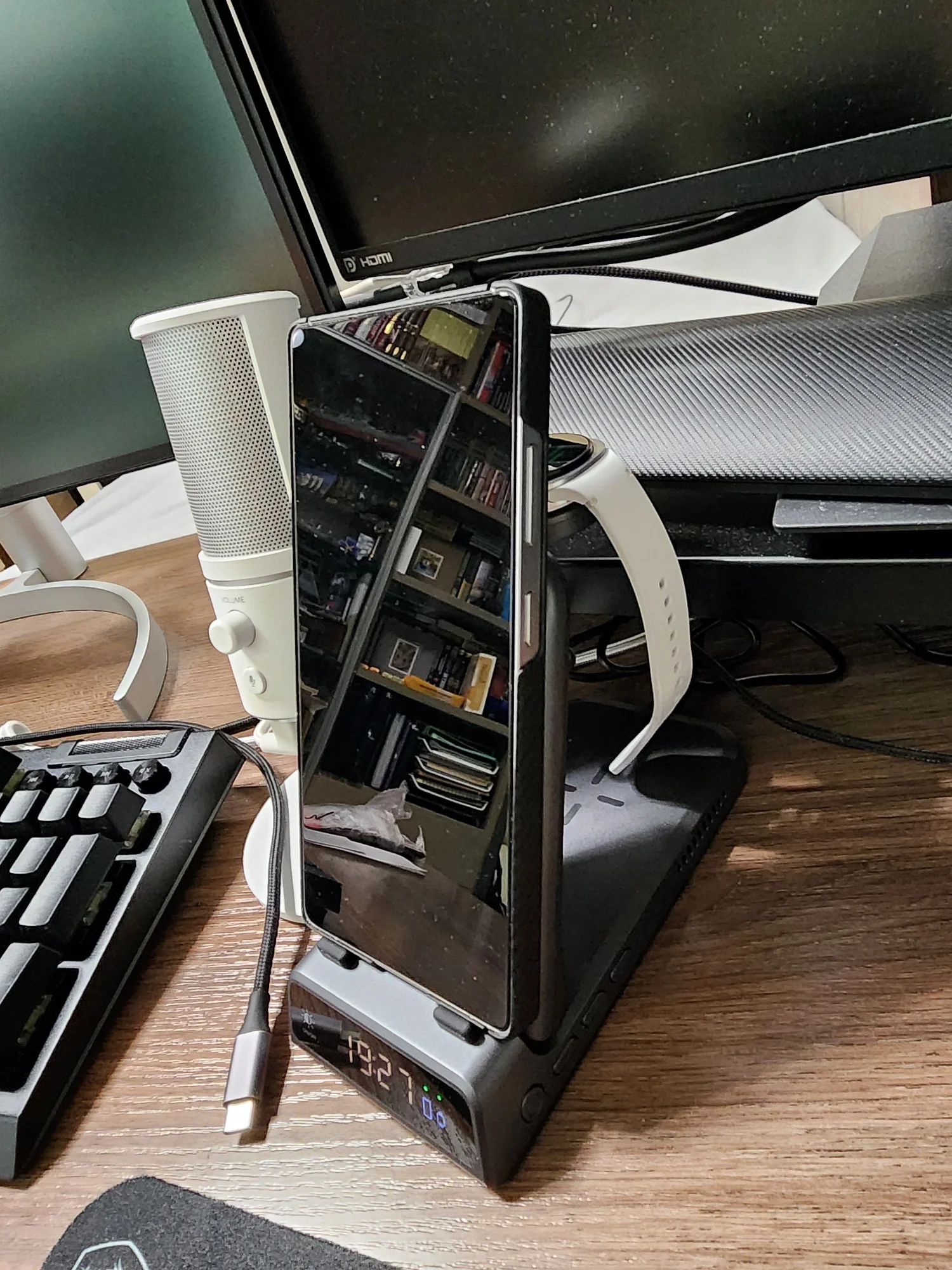 Excellent charging station, matches the description. It can indeed charge a phone, watch, and headphones simultaneously (instead of headphones, you can place a second phone, but the charging type will be lower). Fast wireless charging works for Samsung Galaxy S25 Ultra, charges Galaxy Watch 8 and Buds Pro without issues. The built-in clock with different brightness levels is a nice addition. You can also 'disable' the charging function and use it as a stand. Another plus is the mobility of the design.